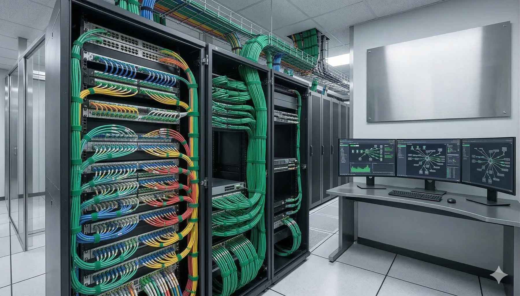 Le câblage, la fibre, les racks et les locaux réseau viennent soutenir les systèmes principaux.